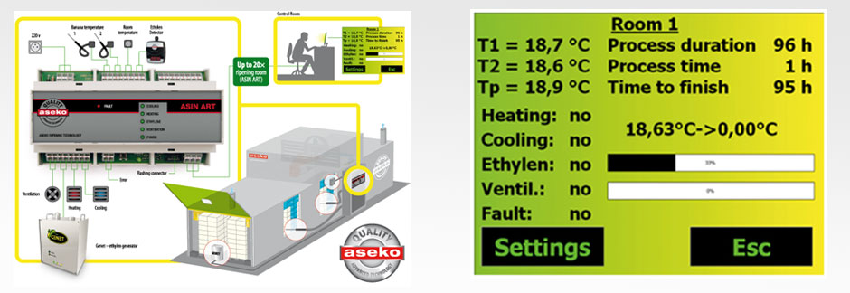 | GENET is the brand name of Ethylene Generators manufactured by Aseko based in Czech Republic. Agritech Equipment & Services Pvt. Ltd are the sole distributors of all products manufactured by Aseko in India, which includes ethylene generators, gas sensors, ripening liquid, etc. Aseko manufactures a wide range of gas sensors, gas controller, biogas analyzers, RHT etc as well as centralized ripening control system using software for optimal results.You can connect between 1 to 20 ripening rooms with the same software and manage operations through mobile phones or laptops or tablet PCs. Ripening is a process in fresh fruits that causes them to become more palatable. In general, a fruit becomes sweeter, less green, and softer as it ripens. Bananas are harvested in mature green condition and transported great distances where they are induced to start ripening in controlled atmosphere cold rooms using ethylene liquid which is converted into gas. Ethylene is a natural plant growth hormone produced by all fruits and vegetables in natural habitat. Rule 44-AA of the PFA Rules, 1955 prohibits the use of carbide gas for ripening of fruits. Rule 44-AA : Prohibition of use of carbide gas in ripening of fruits:- No person shall sell or offer or expose for sale or have in his premises for the purpose of sale under any description, fruits which have been artificially ripened by use of acetylene gas, commonly known as carbide gas. Ministry of Agriculture has clarified that the fruits are exposed to ethylene gas (fruit ripening plant hormone) in low concentration of 10-100 ppm exogenously to trigger their ripening. It is considered safe in the concentration varying from 0.001- 0.01% depending upon the crop, variety and maturity. There is no specific provision in PFA for ripening agents. |